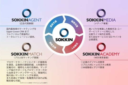 株式会社SOKKINは、『デジタルの力で、もう一度日本を世界有数の産業先進国にする』という大きなミッションを掲げており、デジタル・デバイドを無くし「質の高いマーケティングを全企業へ」提供するため、国内最高峰の環境で培ったデジタルマーケティングとテクノロジーを武器に、デジタルマーケティングにおいて、お客様のフェーズにあわせたデジタルデバイドを解決するソリューション(広告代理事業・人財マッチング事業・メディア事業・WEB教育事業)を展開しています。