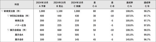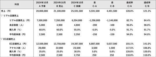 例2)店舗型ビジネスにおける「売上」および「売上の構成要素」の予実分析