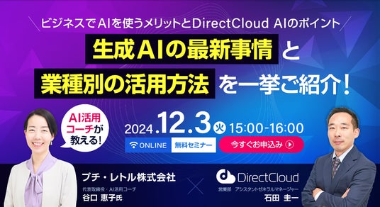 DirectCloudで更なるドキュメントデータ活用を推進する株式会社ダイレクトクラウド(本社:東京都港区、代表取締役:安 貞善、以下ダイレクトクラウド)は、2024年12月3日(火)に「生成AI×クラウドストレージ」をテーマにオンラインセミナーを開催いたします。