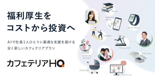 「カフェテリアHQ」は、企業が社員に一定額のポイントを支給し、社員がそのポイントの範囲内でメニューを自由に選択・利用できる「カフェテリアプラン(選択型福利厚生)」に、AIを活用したレコメンドエンジンを搭載することで、旧来型福利厚生を”再発明”した、従来の課題を解決する「次世代型の福利厚生」です。