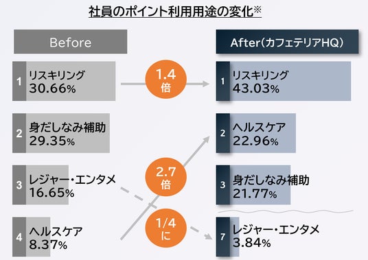 ※従来カフェテリアプラン利用時情報との比較 「カフェテリアHQ」導入1ヵ月の利用結果にて算出カフェテリアプランにおけるポイント用途を以下8カテゴリで集計a)リモートワーク、b)リスキリング(スキルアップ)、c)フィットネス/運動、d)ヘルスケア、e)出産・育児、f)介護、g)身だしなみ補助、h)レジャー・エンタメ