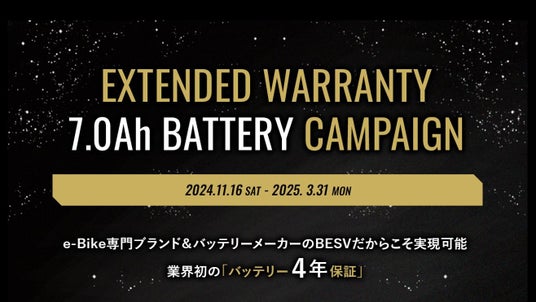株式会社BESV JAPANは、BESV 10th Anniversary Year企画の第7弾として、2024年11月16日(土)から2025年3月31日(月)の期間中、対象の新車購入のお客様に任意でお申し込み頂ける「''7.0Ahバッテリー''延長4年保証キャンペーン」を実施いたします。
