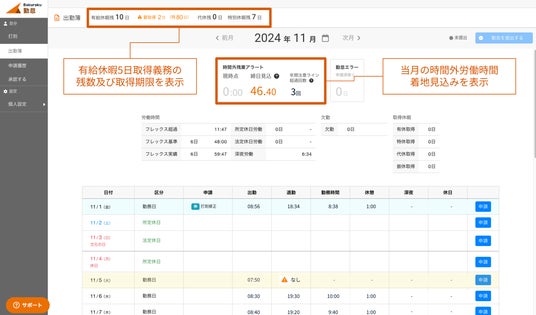 バクラク勤怠は、勤務実態や必要な申請状況をわかりやすく把握できるサービスです。従業員は労働時間や休暇取得を自己管理しやすくなり、管理職は時間外労働の予測値や有給休暇の取得状況を一覧で確認することで、過重労働や有給休暇の未消化を早期に検知できます。