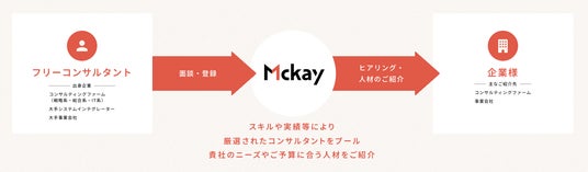 「Mckay(マッケイ)」は、デジタル領域に特化したスキルや実績等を基に厳選された経験豊富なフリーコンサルタントと、コンサルタントに課題解決を依頼したい企業を繋げる案件マッチングサービスです。