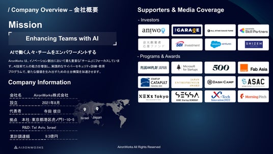 AironWorksは "Enhancing Teams with AI" を企業ミッションに、グローバルなR&D拠点で開発するAIを活用したサイバーセキュリティプラットフォームを通じて、働く人々・チームをエンパワーメントして、よりよい社会の実現に貢献します。