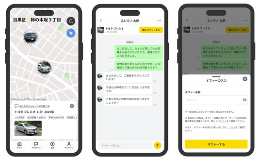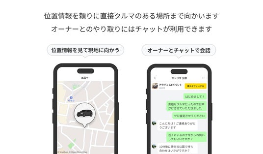 - 車を買いたい個人や事業者は、アプリのマップから気になる車を探し、興味を持った車のオーナーとチャットでやり取りしながら、実際に落ち合って現車の確認をします。