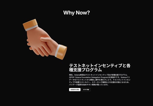 現在、Solana財団はテストネットインセンティブおよび支援プログラム(SFDP: Solana Foundation Delegation Program)を実施しています。このプログラムにより、テストネット上でのバリデータ運用に対してインセンティブやメインネット運用時投票コストの補填、ステーキングの補助などが提供されており、バリデータを始めやすい環境が整っています。