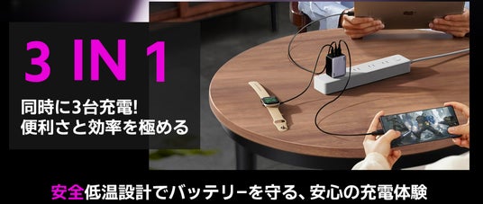 Type-C×2、USB-A×1の3ポート搭載で、ノートパソコンやタブレット、スマートフォンなどを同時に充電可能です。リビングやオフィスでも複数のデバイスを一気に充電でき、配線もすっきりと整理。充電ポートの奪い合いから解放され、家族や同僚ともシェアして使えます。