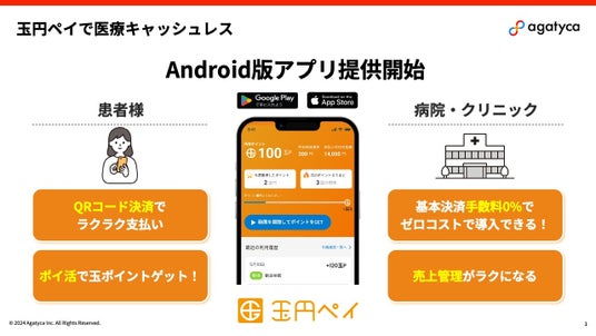株式会社アガティカ(本社: 山口県宇部市中央町2-5-17新光産業株式会社中央町ビル3階 代表取締役社長: 藤井 佑機)は、病院・クリニックで基本決済手数料0%で使えるQRコード決済アプリ「玉円ペイ」Android版アプリを2024年11月18日にリリースしました。