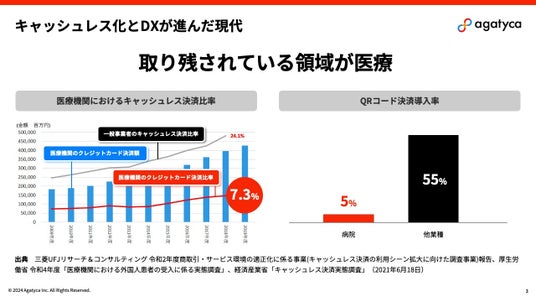 現在の日本では、 QRコード決済アプリやクレジットカード等様々なキャッシュレス決済の普及でキャッシュレス化が進みつつあります。一方で医療分野においては、決済手数料など様々な要因により他業種に比べてキャッシュレス化が遅れているという課題が存在します。