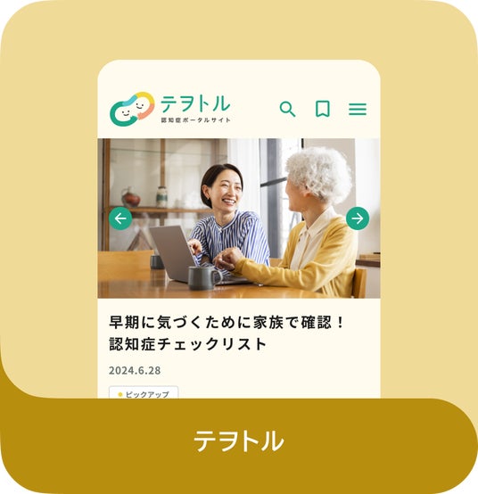 認知症ポータルサイト「テヲトル」は、2024年10月1日にリニューアルし、認知症に関わるすべての人が「最適なタイミングで最適な選択肢を知る」ことができるよう、認知症の種類や原因、治療に関する情報や介護方法・体験談など、認知症とともに歩むみなさまに向けたコンテンツやサービスをご紹介しています。