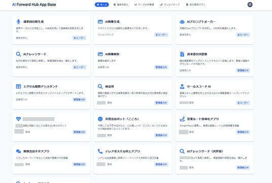 ▶生成AIアプリアイデアソンで生まれたアイデアを汎用化するため、AIアプリが開発されました。このアプリはAIフォワードハブの『AppBase』プラットフォームで運用され、「ロールプレイボット」、「会話共感ボット」「テレアポスキル向上ボット」などが実装されており、利用されながら継続してブラッシュアップがされていきます。