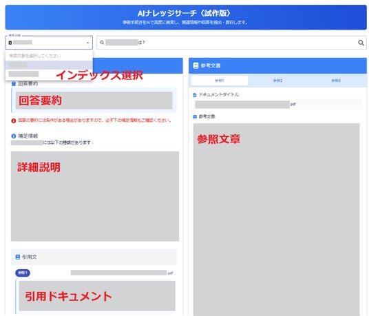 ▶組織内マニュアル連携(12月運用予定)RAG(拡張検索生成)を活用し、組織内に蓄積された膨大なマニュアルをChatGPTと連携させ、回答を得られるシステムを構築しています。これによりマニュアル検索や特定に費やす時間削減を目指しています。対象マニュアルごとにインデックスが作成され、回答の参照元を出力するなど、精度向上の工夫も凝らされています。
