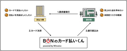 本サービスにより、バイヤーでは銀行振込で届いた請求書をカードで支払う事で疑似的に支払いサイクルを遅らせたり、サプライヤーでは迅速に代金を回収する事が可能となります。