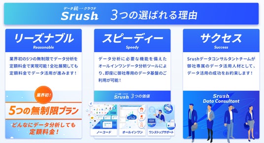 データ人材がいなくてもデータ活用が進むオールインワンデータ分析ツール「データ統一クラウドSrush」と、データ基盤の構築からデータ分析の定着支援まで行う「コンサルティングサービス」を提供しています。業界初の【ライセンス数・データ連携数・データ容量・ダッシュボード&グラフ作成数・チャットサポート】 の5つが無制限になる革新的プランでデータドリブン経営を定額料金で実現できます。