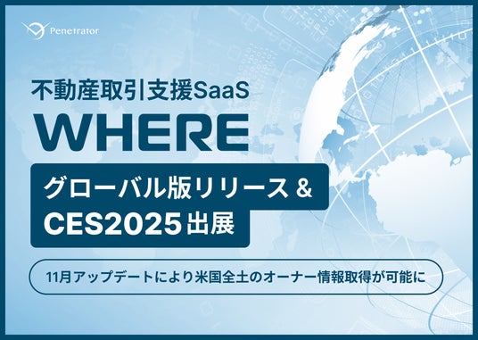 JAXA発スタートアップであり、衛星データとAIで不動産仕入れのすべてのプロセスをDXするSaaS『WHERE』を提供する株式会社Penetrator(本社:東京都文京区、代表取締役:阿久津岳生、以下Penetrator)は、2024年11月に不動産取引支援SaaS『WHERE』のグローバル版をリリースしたことをお知らせいたします。また、来年2025年1月7日~10日に米国・ラスベガスで開催の「CES2025」にJAPAN パビリオンの出展企業の一社として出展し、グローバル版『WHERE』を展示いたします。
