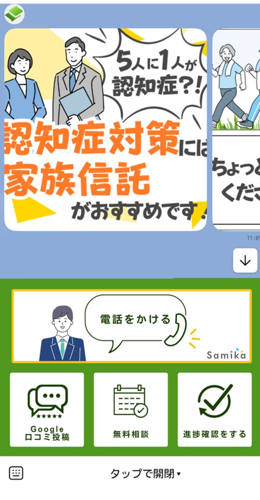 遺言書作成や家族信託、成年後見など生前対策、財産管理などに関するお役立ち情報をLINEを通じて定期的に配信(月2回)する機能です。