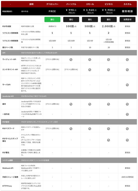 外部に公開できないWEBコンテンツにてPDFを作成したい、作成したPDFデータを自社システムに保存したいというような場合には、「カスタム」プランにて対応しています。