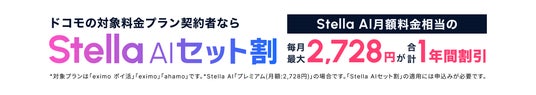 また、SUPERNOVAは株式会社NTTドコモ(以下、ドコモ)との業務提携を開始します。本提携により、「eximoポイ活(TM)」・「eximo(TM)」・「ahamo(R)」をご契約のお客さま向けに、11か月間「Stella AI」月額料金相当額の割引する※1「Stella AIセット割」を提供します。「Stella AIセット割」と「初月無料キャンペーン※2」を合わせて、合計1年間割引が適用されます。
