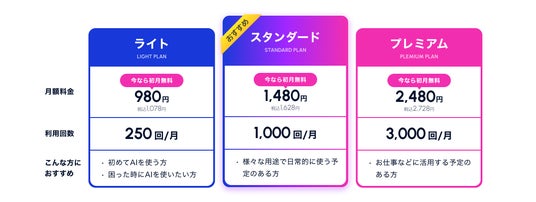 お客さまのニーズに合わせ、利用回数※7に応じた「ライト」「スタンダード」「プレミアム」の3つの料金プランをご用意しました。他社の生成AIサービス(月額3,000円程度※8)よりも、リーズナブルにご利用いただけます。