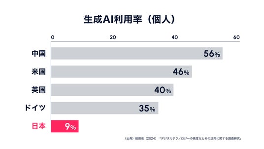 日本は現在、少子高齢化の加速による労働生産人口減少が顕著であり、生成AIを活用した業務効率化が急務です。しかし、生成AI利用が急速に普及する世界と比較して、日本の生成AI利用率はわずか9.1%※4と、大きく下回っています。