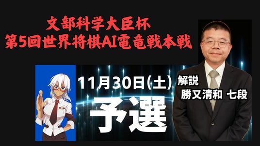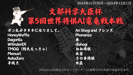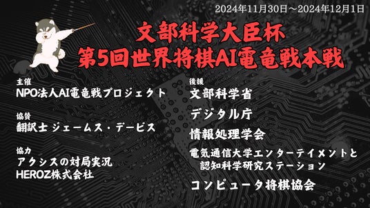 特定非営利活動法人AI電竜戦プロジェクト(理事長:松本 浩志)は、文部科学大臣杯 第5回世界将棋AI電竜戦本戦を2024年11月30日-12月1日に開催いたします。今年で記念すべき5年目となる本大会は優勝者には文部科学大臣賞を表彰するはこびとなりました。