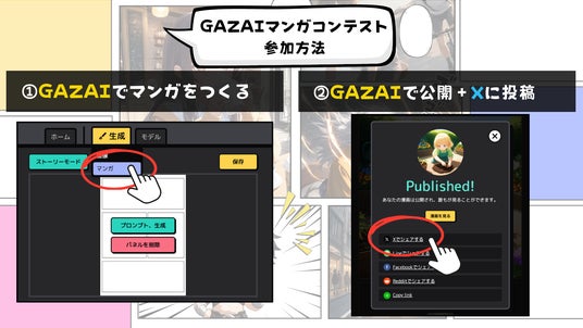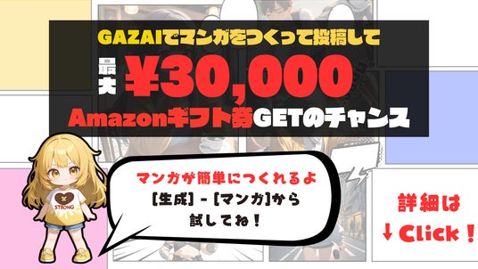 株式会社GAZAI(本社:東京都渋谷区、代表取締役:一岡亮大、以下「当社」)は、生成AIプラットフォーム「GAZAI」(https://www.gazai.ai/ja-JP)にて、11月23日(土)10時から11月29日(金)23時59分迄、誰でもマンガを簡単につくれるサービス「GAZAIマンガビルダー」をつかったマンガコンテストを実施致します。