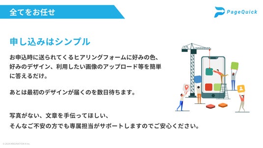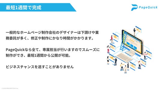 株式会社IMAGINATION X(本社:北海道札幌市、代表取締役:相庭 至)は、月額定額制ホームページ制作サービス「PageQuick(読み:ページクイック)」を、2024年9月23日(月)よりサービス提供開始いたしました。