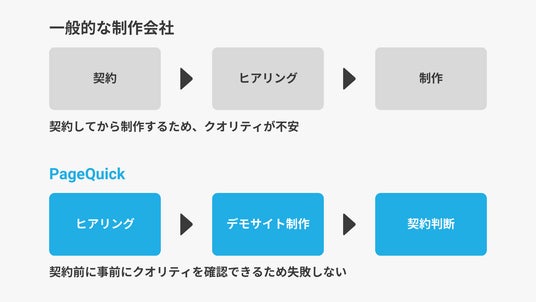 その課題を解決するため、PageQuickでは、以下のような流れで「デモサイト無料制作キャンペーン」を実施中です。