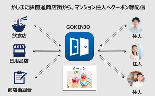 GOKINJOの「パートナー連携機能(※1)」を用いることで、かしまだ駅前通商店街の各店舗や商店街振興組合からマンション居住者様への情報配信を行います。店舗からのお得なクーポン等の情報や、商店街振興組合からのお祭り・イベントなどの情報を、居住者様がアプリからタイムリーに確認することが出来ます。居住者様の生活利便性の向上や、商店街の集客・収益増による地域の活性化を目指します。