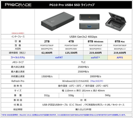 プログレードデジタルは、USB4 40Gbps 外付SSD PG10 Pro(2TB, 4TB, 8TB)を 3種類の容量、4つのラインナップで販売を開始しました。税込価格は、 2TB 62,800円、4TB 125,500円、8TB 219,600円(Windows専用、Mac専用)です。
