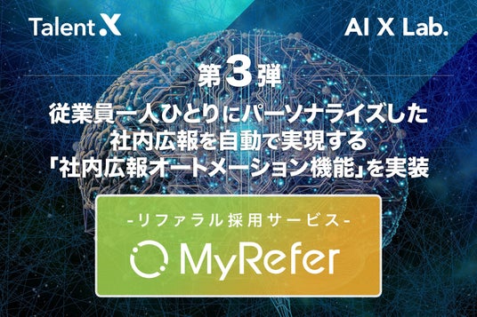 株式会社TalentX(本社:東京都新宿区、代表取締役社長:鈴木貴史)は2024年10月、AIと自動化で日本企業の採用変革を加速させる新組織「AI X Lab.」より第3弾機能リリースとして、リファラル採用サービス「MyRefer」に従業員一人ひとりにパーソナライズした社内広報を自動で実現する「社内広報オートメーション機能」を実装しました。