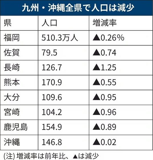 引用:日経新聞(九州7県の人口、0.6%減1256万人 沖縄も2年連続減少)