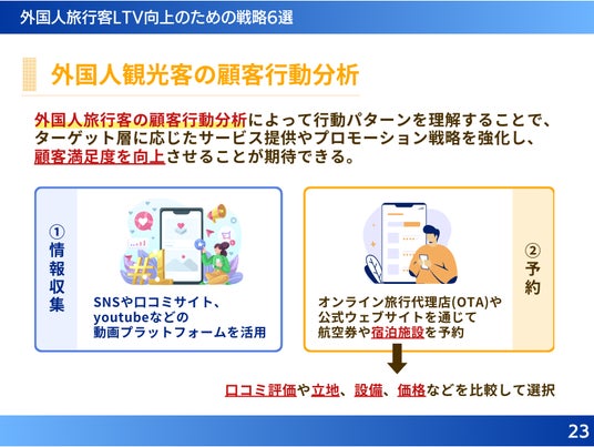 本レポートでは、外国人旅行客の特徴や外国人旅行客増加の動向の背景について言及しています。また、旅行情報の収集方法から予約、旅行中の行動、帰国後のレビューまでの顧客行動を分析し、ターゲット国のSNSプラットフォーム活用法やインフルエンサーとのコラボレーションについても紹介しています。