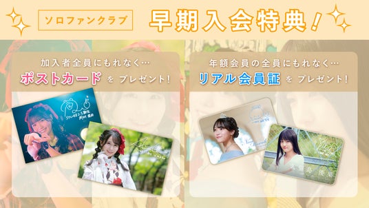 ソロファンクラブでは、限定写真やブログのほか、会員限定の単独イベント・ファンミーティングを開催します。また、メンバーがプロデュースするファンクラブ限定グッズの販売など、さまざまな特典をお楽しみいただけます。