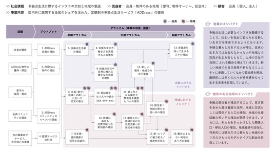 これらの数値は業務データや会員・家守のアンケート調査から導き出していますが、数値評価をする根拠となるのが「ロジックモデル」(=以下)です。初版をリリースする際に、出資者の一般財団法人社会変革推進財団(所在地:東京都港区、理事長:大野修一)と立命館ソーシャルインパクトファンド投資事業有限責任組合(プラスソーシャルインベストメント株式会社、本社:京都府京都市、代表取締役社長:野池雅人)と共同プロジェクトで取り組み作成しました。