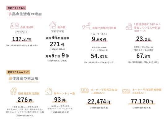 ADDressが目指す最初のアウトカムである「多拠点生活者の増加」は、冒頭で述べたように昨年同月比で137.37%(2024年8月時点)増となりました。会員の年間平均予約数は1年間で9.68件、総予約数に占めるリピート予約の比率は54.31%でした。年間平均予約数は昨年の17.3件から減少していますが、月2泊分からライトに利用できる料金プランを開始したことによる影響と考えられます。