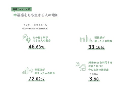 アンケート調査では「心の拠り所ができた」と答えた人が46.63%、ADDressを利用する以前と比べた今の生活の満足度も3.98(5段階中)の結果でした。孤独感が減った人の割合は33.16%、幸福度が高まったと感じた人は72.02%でした。ADDress多拠点生活による「人との関わり」を通じ、生活圏内や短期旅行では得られない「視野の広がり」を得られたという意見が複数ありました。なかには「また訪れたい『家』があるという思いが芽生えた」「第二の故郷ができ、帰りたい場所が日本全国にできた」というような、第二・第三の家を得られたという会員もいました。ADDressが家(住まい)を提供するだけでなく、コミュニティを通じた交流の場を提供していることから生まれた感想といえます。