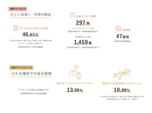 ADDressでは会員や家守、地域住民に新たな出会いや交流、コミュニティ創出の機会を提供しています。ADDressのサービスを通じて10人以上と交流した会員は46.63%、地域の清掃活動などのイベントはオンライン・オフライン含め297件開催され、参加表明をした人は1,459名になりました。また、会員や家守が立ち上げた部活動は47つで、アンケート調査では「家守の紹介で地元民でにぎわうローカルな飲食店に連れていってもらえた」「家守の親戚や地域住民と共に食卓を囲んだ」など、ADDressの家守が地域住民や他会員とのコミュニティのハブとなり、さまざまな「 縁 」をつないでいることが垣間見られます。