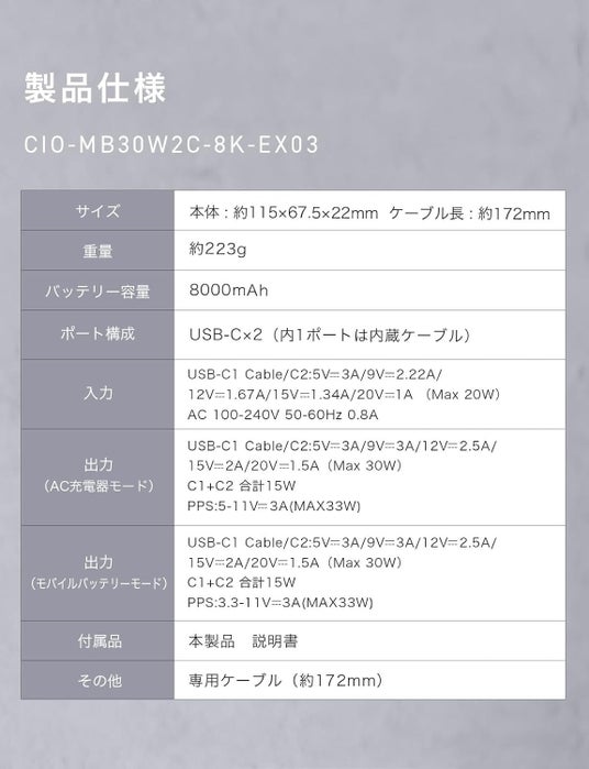 ・商品情報「SMARTCOBY Ex03 SLIM PLUG & CABLE」(CIO-MB30W2C-8K-EX03)