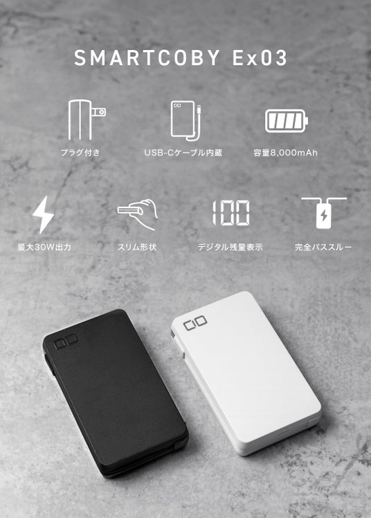 株式会社CIO(本社:大阪府守口市)は、応援購入サービス「Makuake」にて約1,400万円を超えるご支援をいただき製品化した、自宅ではAC充電器、外出先ではケーブル内蔵のモバイルバッテリーとして使える全部入り「SMARTCOBY Ex03 SLIM PLUG & CABLE」をAmazon.co.jpにて6,580円(税込) にて11月27日(水)より予約販売を開始いたします。