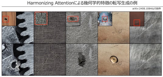 データグリッドは、自社で開発の生成AIアーキテクチャ「Harmonizing Attention」を活用し、Anomaly GeneratorでのNG画像生成に応用しています。「Harmonizing Attention」は、コンピュータビジョンの国際会議WACV2025に採択された技術であり、テクスチャと幾何学的特徴を独立して抽出・生成することを可能にします。この技術により、例えば木材の穴を金属ギアの表面に再現したり、タイルのヒビを繊維に移植したりといった品種間での高度な特徴転写が実現できるようになりました。