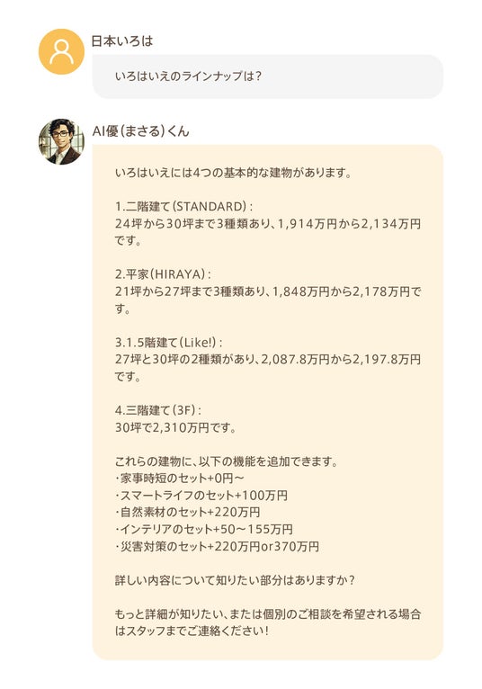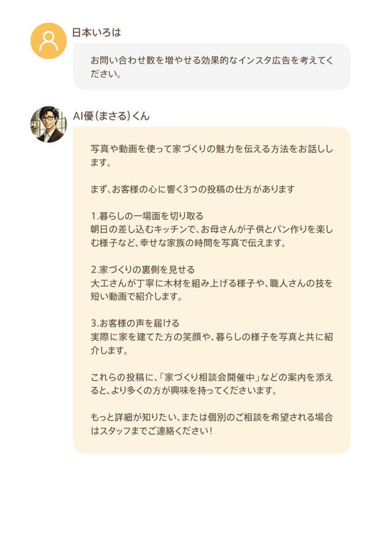 株式会社THA(本社:東京都新宿区、代表取締役:西山朝子)は、岡山市に本部を構える住宅FC事業を展開する株式会社ジャパンアイディアホーム(代表取締役:大田康之)に「AI社長」を導入し、ジャパンアイディアホーム様専用AI「AI優(まさる)くん」を開発したことをお知らせいたします。