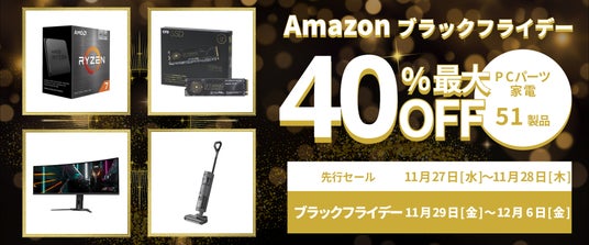 【Amazon ブラックフライデー】PCパーツやゲーミングモニター、水拭き掃除機など 51製品が最大40%オフ!11/27(水)からAmazonブラックフライデー先行セール開催!