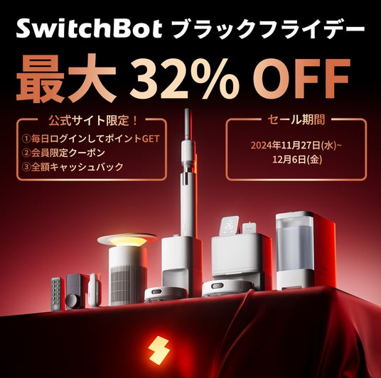 IoT・スマートホーム事業を手掛ける「IoTデバイスNo.1ブランド(※2022年11月 家電Biz調べ )」のSWITCHBOT株式会社(本社 : 東京都渋谷区)は、11月27日(水)0時00分~12月6日(金)23時59分までの期間中、公式サイトにてブラックフライデーに伴うビッグセールを行なっております。