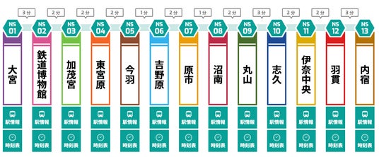 ● 埼玉新都市交通伊奈線(愛称:ニューシャトル):13駅(計14か所)