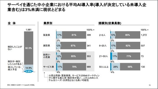 しかし現状では、中小企業におけるAI導入率は3%未満にとどまっています(導入予定の企業を含む)。