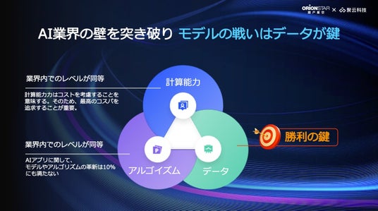 会見では、Cheetal Mobile(チーターモバイル、OrionStarの親会社)の副社長である童寧氏が、AIデータプラットフォーム「AirDS」の成功事例を紹介しました。AirDSは、国内外のモバイル通信分野において、多様なシーンと多言語のデータを効果的に収集し、開発テストプラットフォームを構築しました。さらに、自動化ツールのテストプラットフォームを開発し、ユーザー間の音声インタラクションの翻訳を実現しました。インターネットエンターテイメント分野においても、AirDSは顧客に対して大規模言語モデルデータサービスを提供し、ユーザーが自然な言葉で第三者のアプリケーションやサービスを呼び出すことを可能にしました。また、新エネルギー自動車やインターネット金融、消費小売など、さまざまな業界においてもサービスを展開しています。