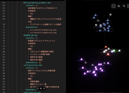 構造化グラフ部分→フレームワーク(本体)とアーキテクト(マルチメディアコンテンツ生成部)とその他のGitHubドキュメントがきれいに分かれて表示されて美しい。