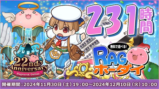 「ラグナロクオンライン」が2024年12月1日(日)で正式サービス開始から22周年を迎えることを記念して、231時間RAGホーダイを開催いたします!